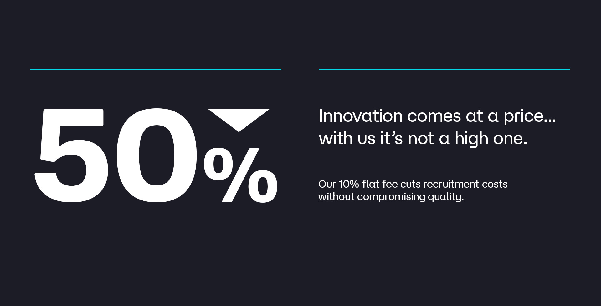 Smarter recruitment shouldn’t mean higher costs. With a flat 10% fee on all roles, you’ll cut your hiring spend in half while maintaining the same exceptional quality. In just a few clicks, you can find the talent you need — let’s get started.